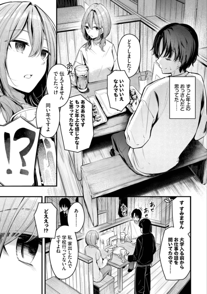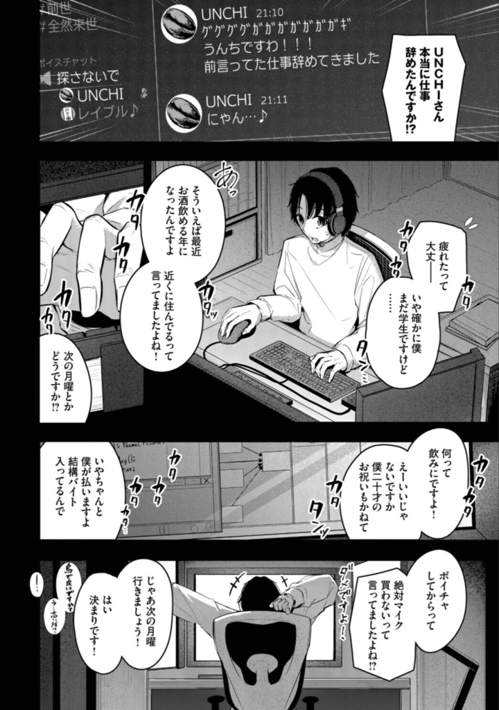 あまりの衝撃に動揺を隠せない主人公。しかし、話し始めればやはり中身はあの「UNCHIさん」。ネット越しに深めてきた信頼関係は、目の前の「美少女」という事実によって、一気に強烈な異性としての意識へと変わります。飲み会を経て、酔い潰れてしまった彼女。主人公は紳士的に介抱し、彼女の部屋まで送り届けますが……そこで彼女から放たれた言葉が、二人の関係を決定的に変えてしまいます。